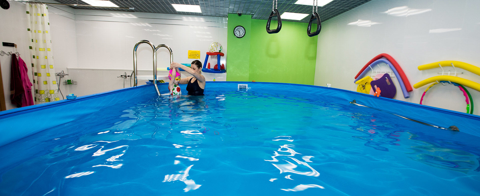В бассейне создана комфортная для детей обстановка: множество игрушек, комната для переодевания и душевая. Температура воды 32-33 градуса, дважды в час происходит многоуровневая очистка воды в бассейне.