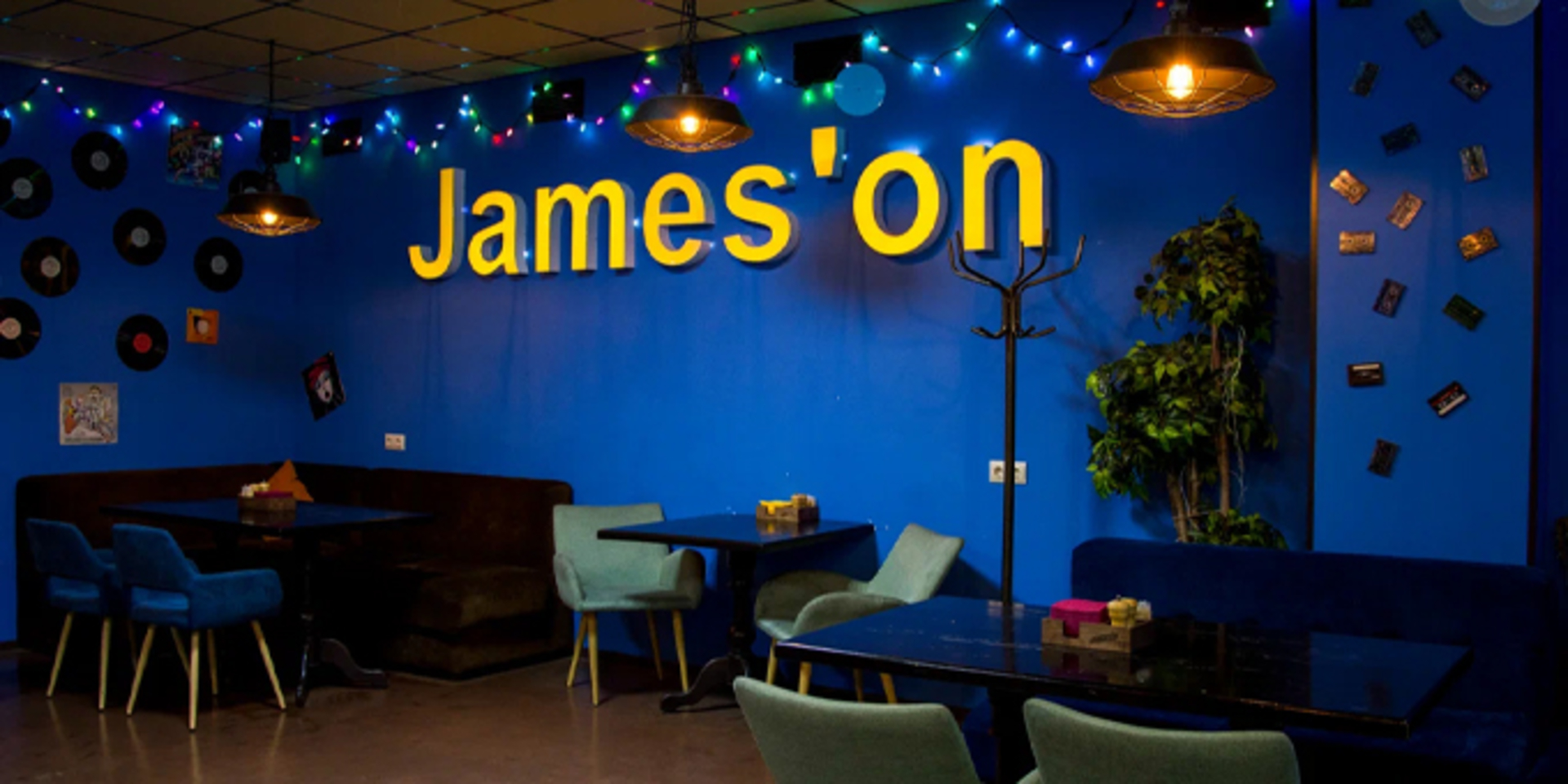 Бар James’on — это место, где можно провести время в уютной и душевной обстановке, слушая спокойную фоновую музыку. Интерьер ресторана выполнен в стиле 90-х, стены украшены пластинками, кассетами, жестяными баночками и гитарами.