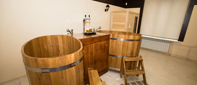 * 2 купели с гидромассажем, которые наполняются по Вашему желанию либо хмельным раствором, либо маслами и травами, температура воды в них 40 °C;