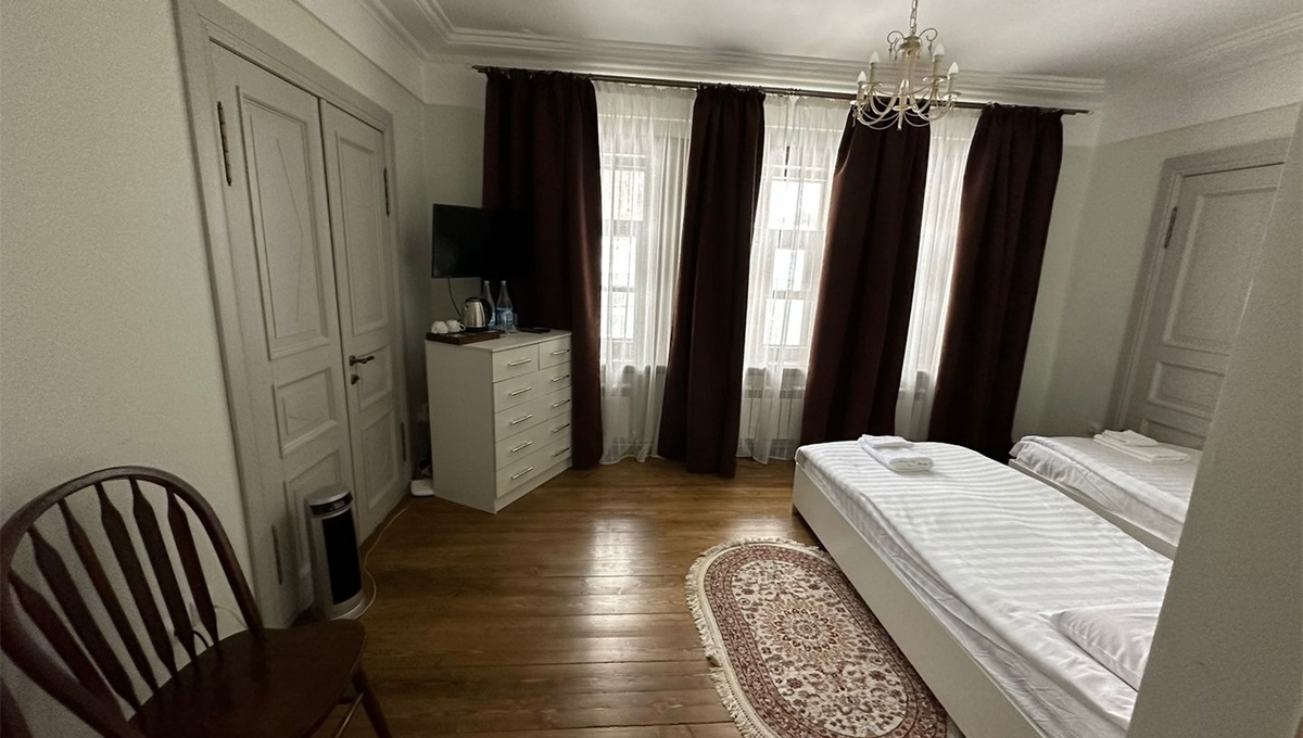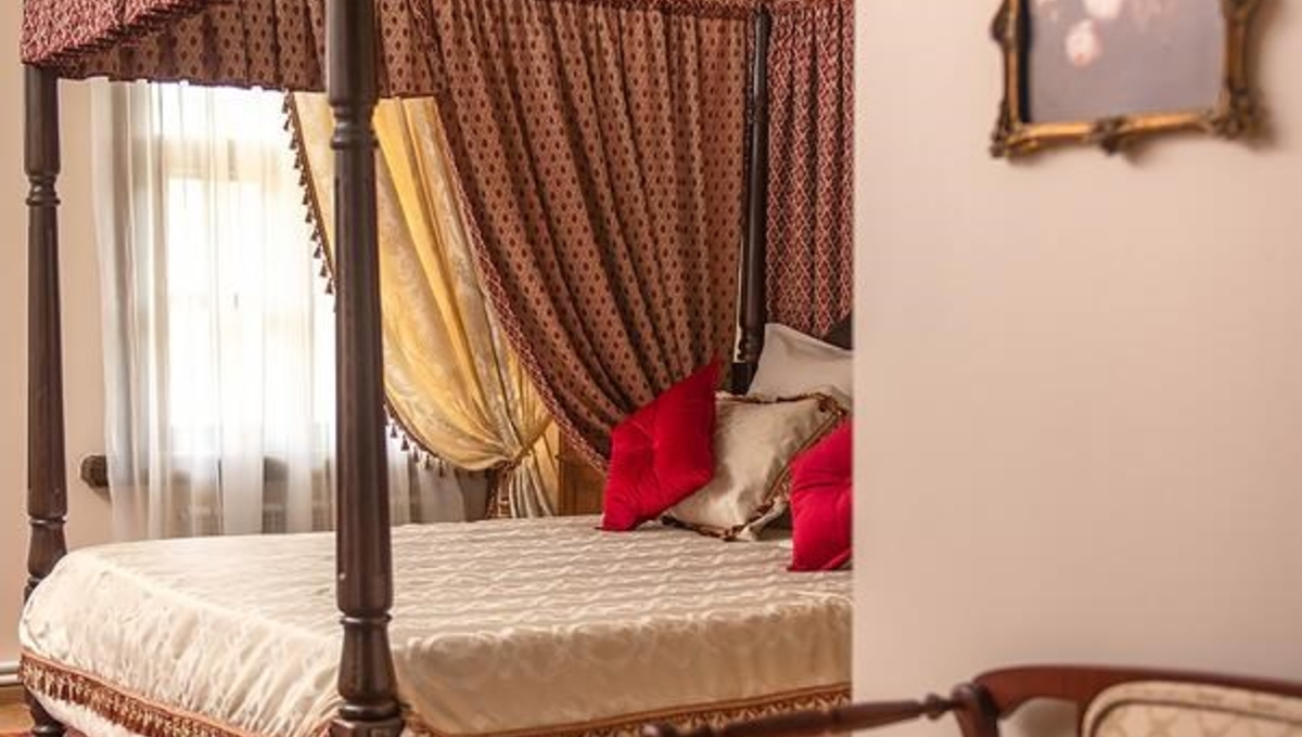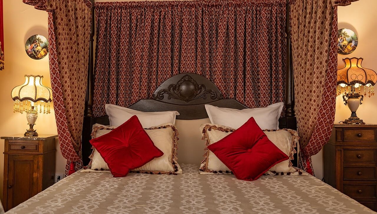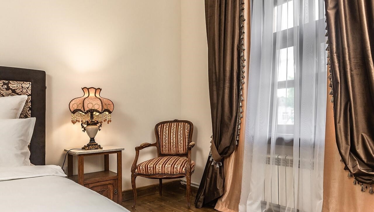 Номера обставлены антикварной мебелью и оформлены в старинном стиле. Гости смогут почувствовать атмосферу того времени. Приятным дополнением станет игристый напиток