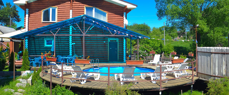 Во дворе в летнее время открыт бассейн с удобными шезлонгами для отдыха и купания, рядом расположена терраса под козырьком, на которой можно вкусно поесть после водных процедур.